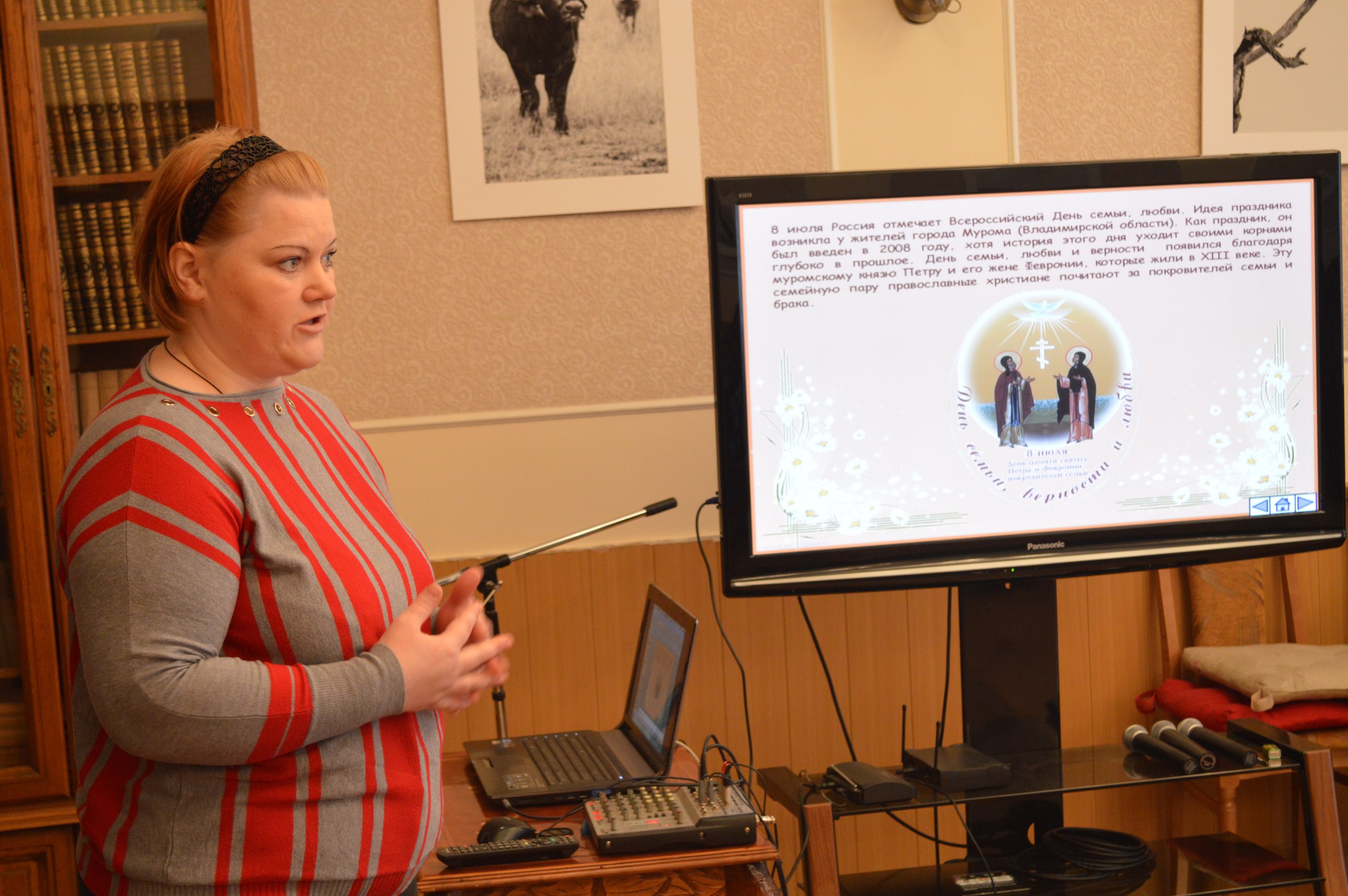 Гостям показали мультимедийную презентацию и рассказали о Петре и Февронии Муромских, посетители узнали об истории Дня семьи, любви и верности, когда его решили отмечать и почему.