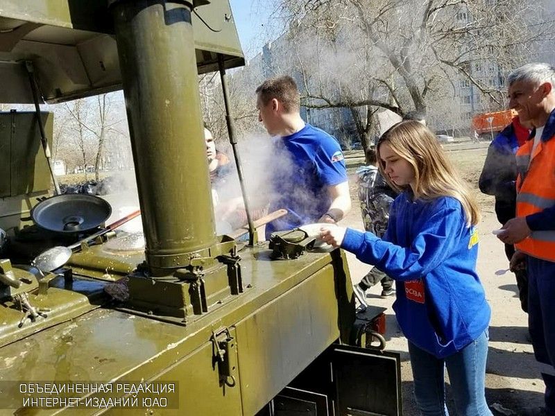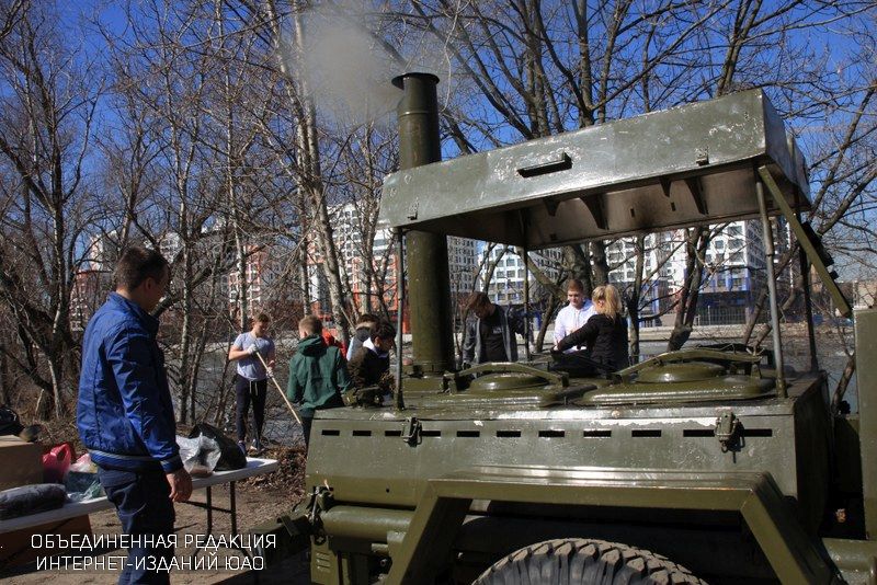 Работа спорилась, чему способствовала и хорошая погода. Одни расчищали дорожки и газоны, другие собирали зимний мусор в мешки. После завершения субботника волонтеры подкрепились гречневой кашей и горячим чаем из полевой кухни.