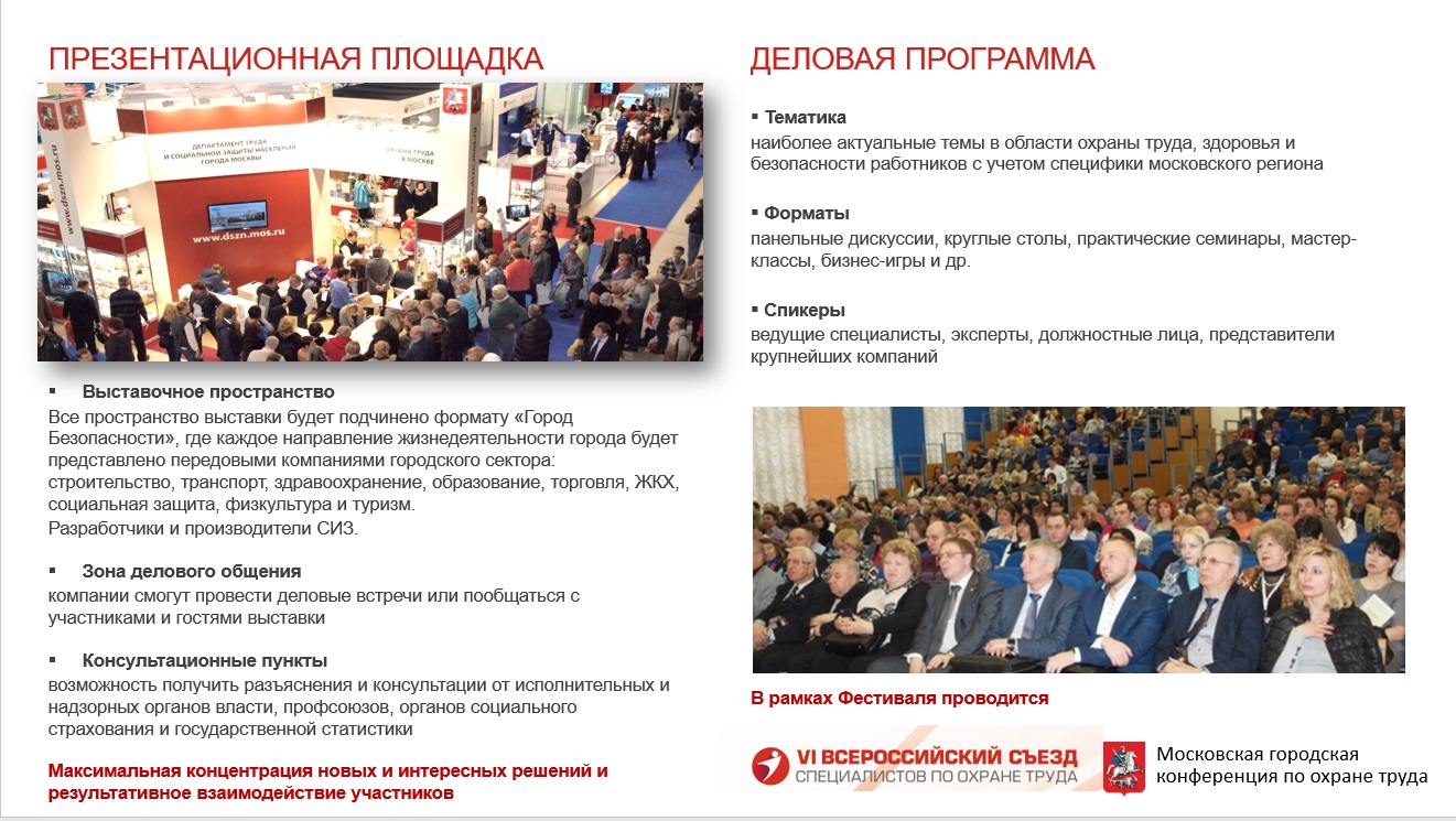 В период с 21 по 24 июня 2018 г. в парке «Сокольники» пройдет IX Городская выставка «Охрана труда в Москве — 2018». В этом году в рамках выставки впервые будет проведен Московский городской фестиваль здоровья и безопасности. Два рабочих и два выходных дня мероприятия позволят любому желающему найти время и возможность принять участие в его насыщенной программе.