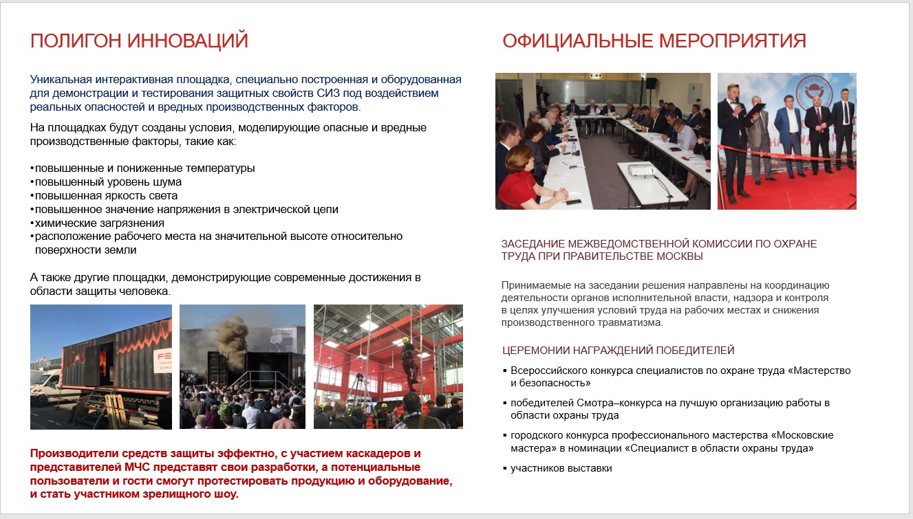 «Безопасность труда – это конституционное право человека, и мы обязаны его защищать. Уверен, что передовые технологии, которые будут продемонстрированы на выставке, помогут всем нам обогатить наши знания и применить их на практике», — отметил министр Правительства Москвы, руководитель Департамента труда и социальной защиты населения города Москвы Владимир Петросян.