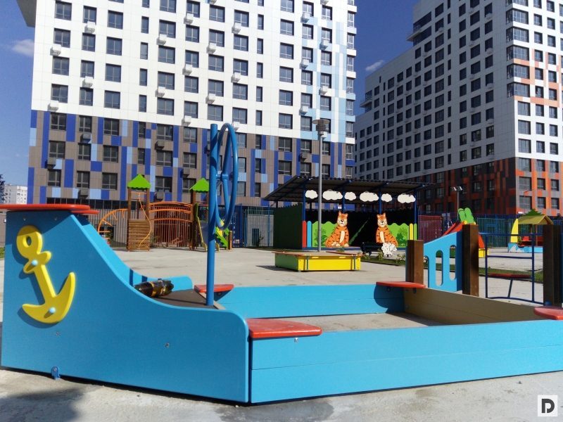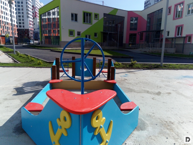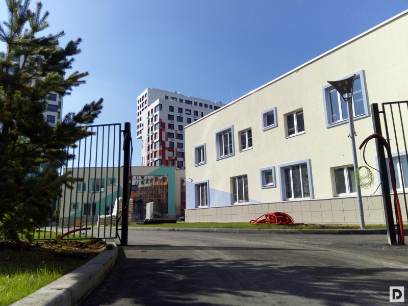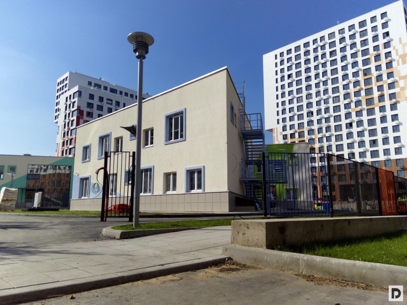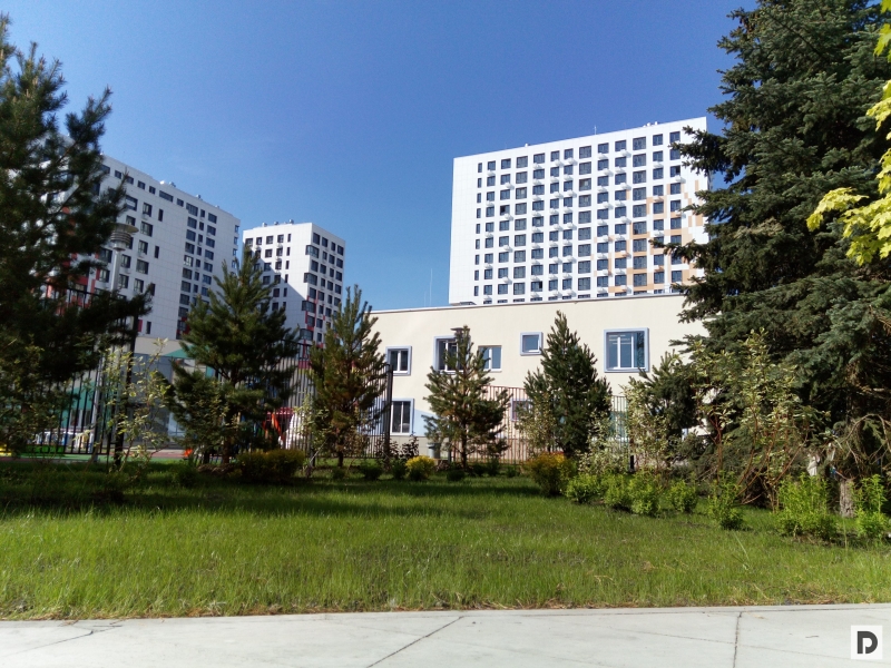 Хорошая новость в том, что детский сад, площадью в 2 600 кв. метров, рассчитанный на 220 детей, уже полностью построен, а рядом строится школа. Внешний облик детского сада, состоящего из нескольких секций и напоминающего по форме пятилистник, органично вписался в архитектурный ансамбль нового квартала.