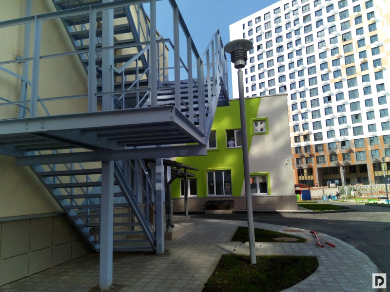 Территория детского сада в ЖК «Ривер-Парк» огорожена. Кроме того, заметно, что проектировщики позаботились о безопасности воспитанников детского сада – все его лестничные площадки оборудованы высокими ограждениями и перилами.