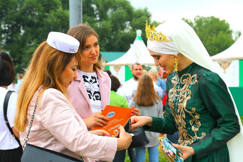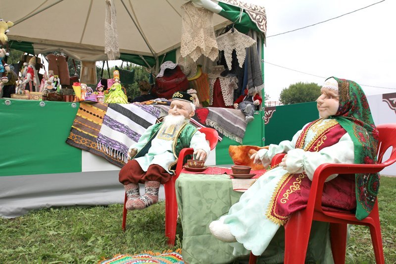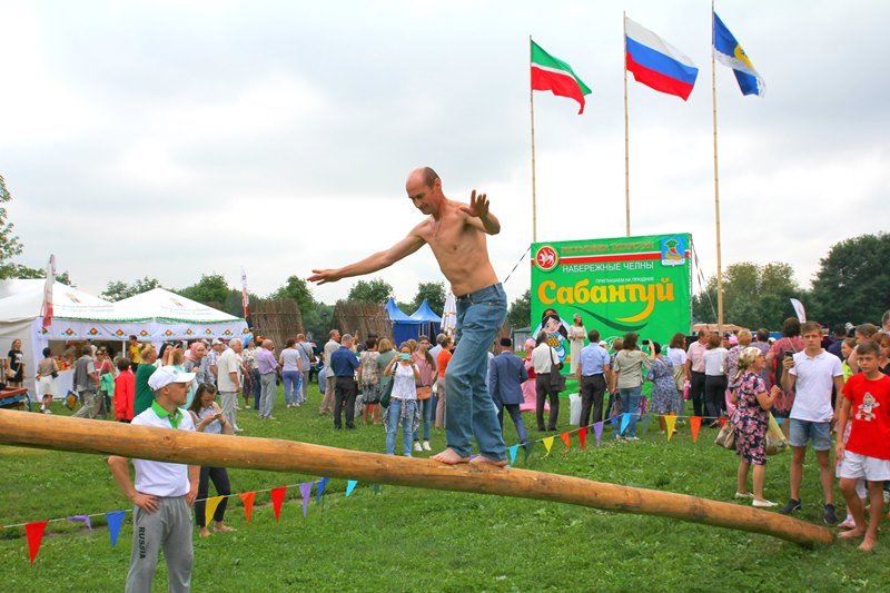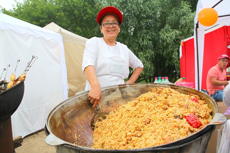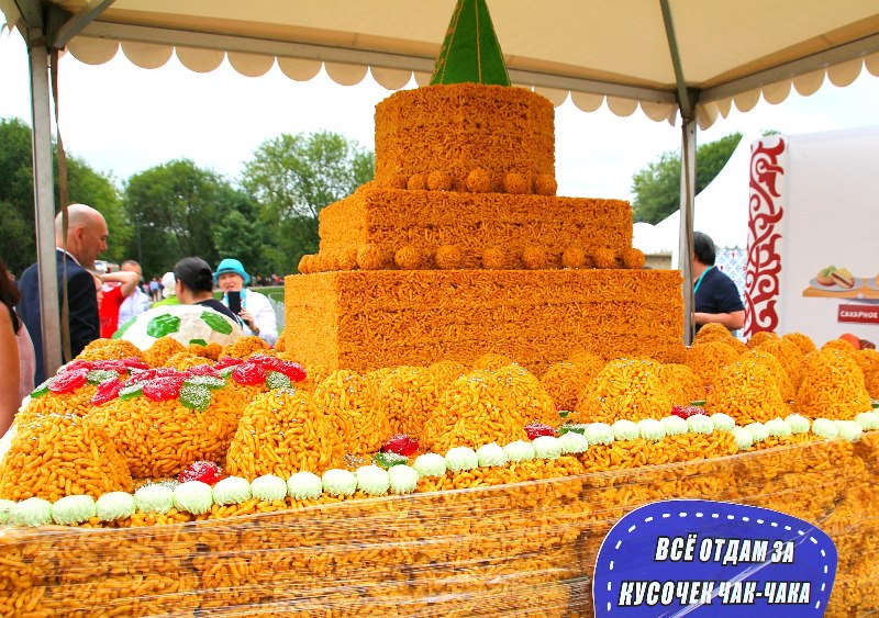 Самые любознательные посетители фестиваля с интересом бродили по аутентичным татарским и башкирским деревням, где можно было погрузиться в атмосферу быта кочевых народов прошлых веков. Здесь же можно было подкрепиться угощениями национальной кухни, которую готовили прямо при вас. Но главный пир царил на центральной аллее «Сабантуя». Столы ломились от всяких национальных вкусностей: горы плова, шашлыки, сладости, напитки на любой вкус. У гостей разбегались глаза – в каждом шатре свое угощение. Но главное блюдо дня – это гигантский чак-чак, весом 2018 килограмм. Из этого татарского лакомства кондитеры воссоздали копию легендарной казанской башни Сююмбике. Только вечером эту гору медового удовольствия, которую готовили пять дней, разделили на кусочки и раздали всем желающим, из которых образовалась огромная очередь.