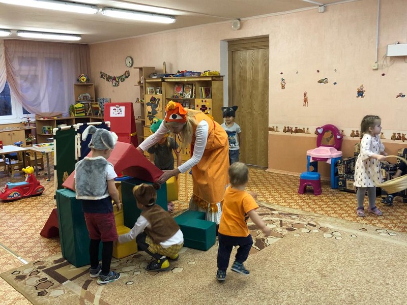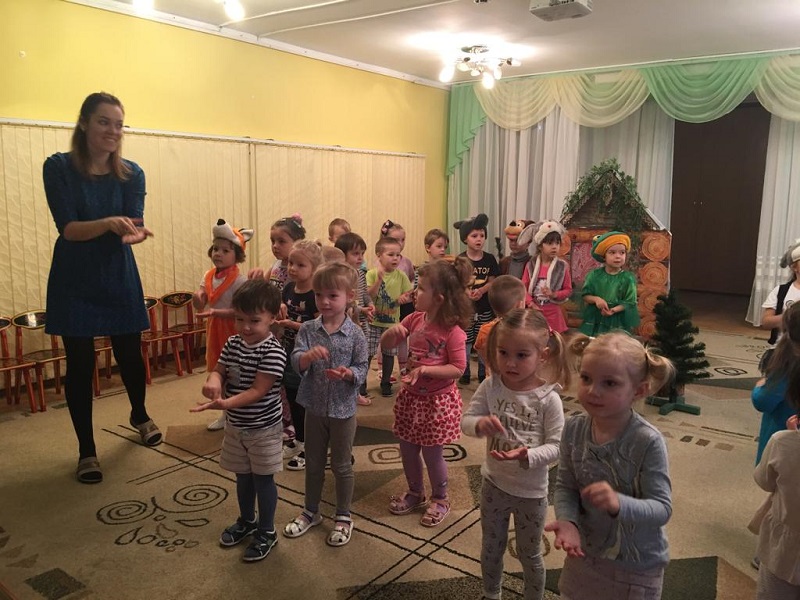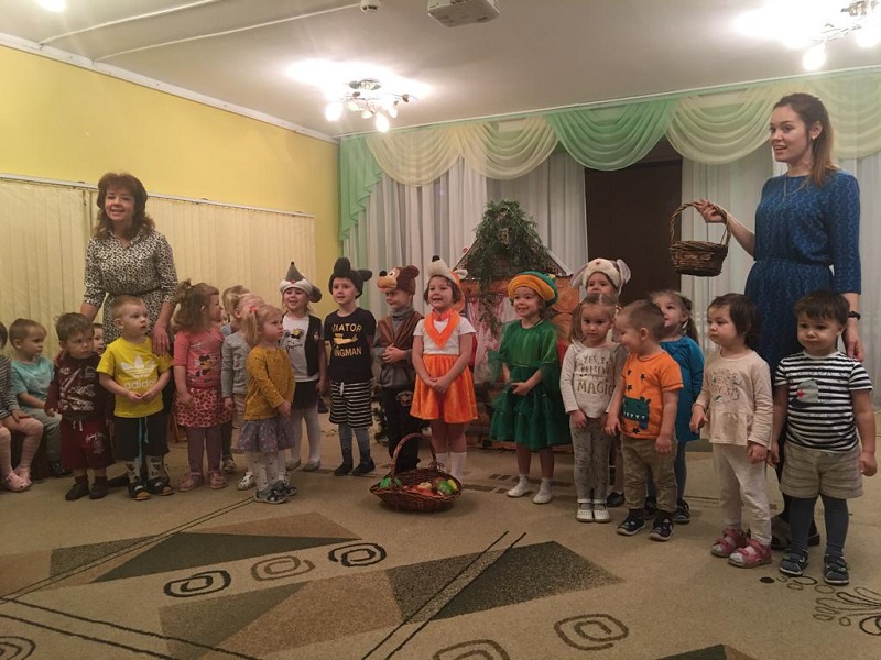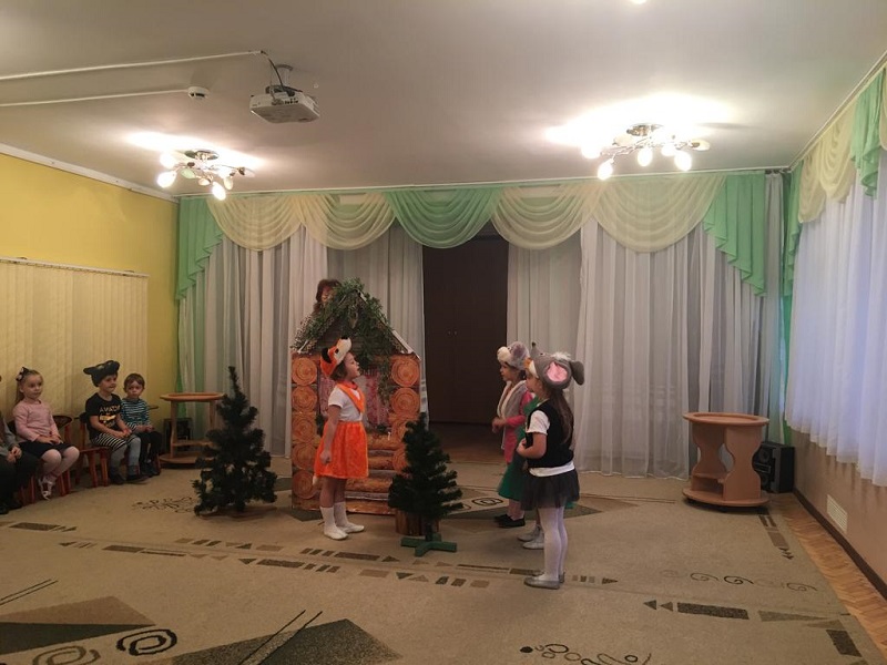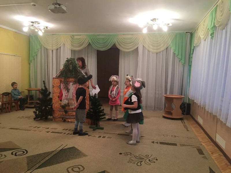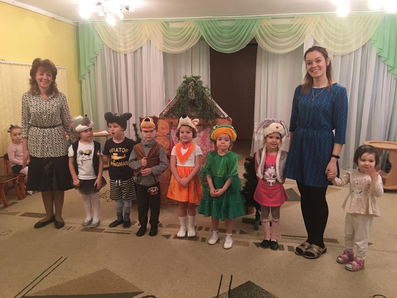 Затем костюмы зверей примерили на себя воспитанники средней группы. Они сыграли «Теремок» для малышей из «Лапочки» и «Сказки». Поддерживали деток воспитатели Ольга Никифорова, Ирина Авраменко.