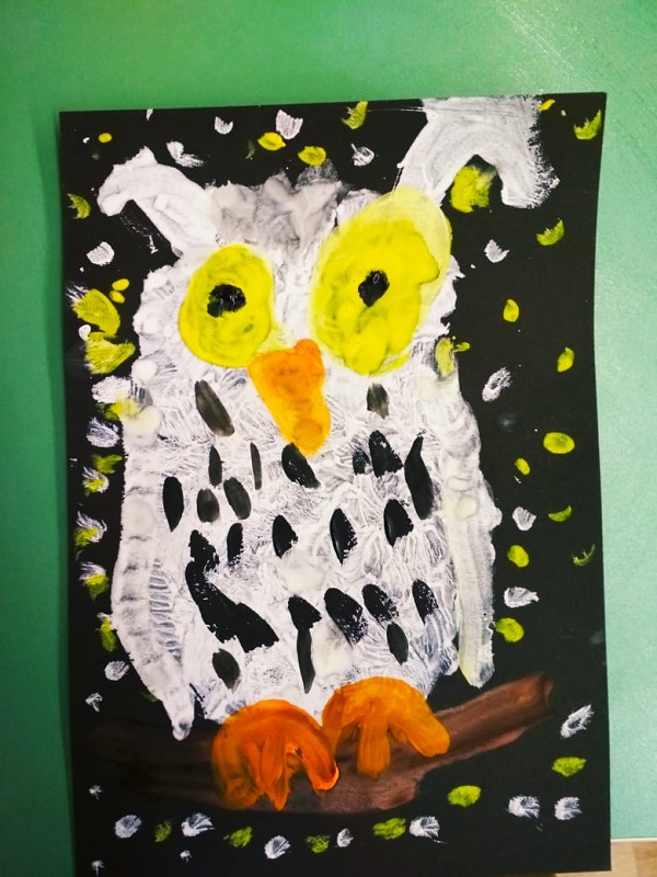 А на занятии в кружке «Крылья творчества» малыши подготовили рисунки. Главной фигурой снова оказалась сова – полярная.