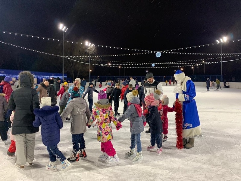 Дед Мороз вместе с ребятами водил хоровод, затем Снегурочка провела соревнования между двумя командами: участники должны были на скорость докатить хоккейную шайбу до конусов и обратно. На новогодней дискотеке побывали, в основном, дети с родителями. Также не осталась в стороне и молодежь. Всего субботним вечером активно провели время на льду более 100 жителей района.