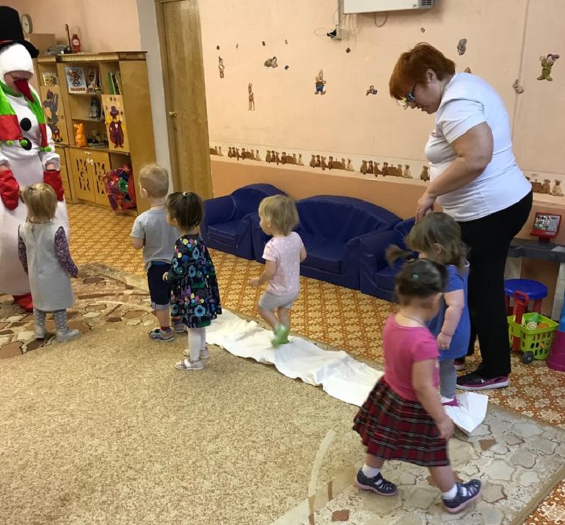Выполняя задания, малыши вовсе не замерзли, ведь вместо снежков и ледяных горок были мягкие шарики и цветные ткани.