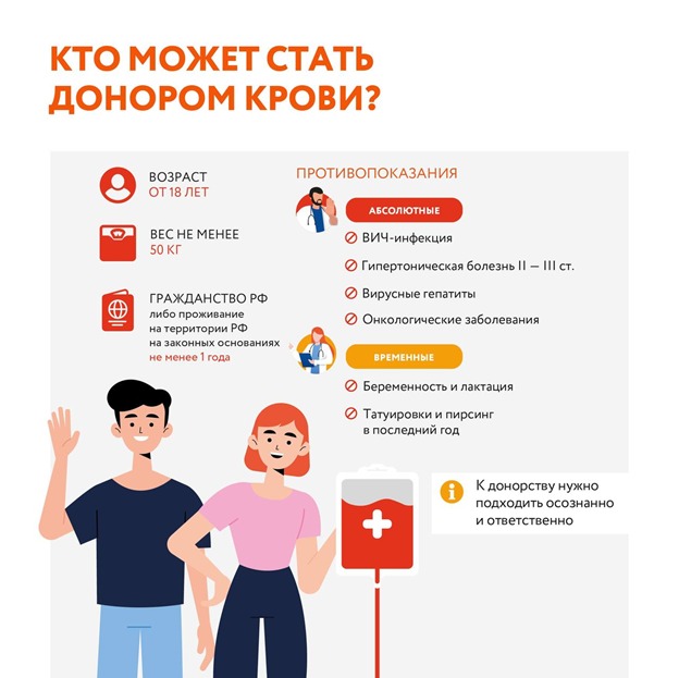 Стать донором можно только на добровольной и безвозмездной основе. Это человек любого пола от 18 и до 60 лет, прошедший обследование и не имеющий противопоказаний. Масса тела донора не может быть меньше 50 кг. Женщинам разрешается сдавать не более четырех раз в год, мужчинам – не более пяти раз, при этом промежуток времени между заборами цельной крови должен составлять не менее 60 суток. В случае сдачи компонентов крови, этот срок составляет 30 дней.
