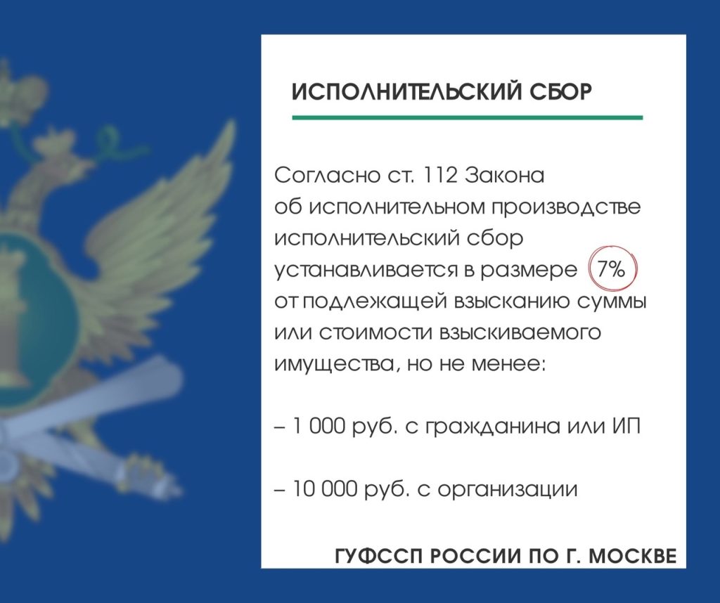 Согласно ст. 112 Закона об исполнительном производстве исполнительский сбор устанавливается в размере 7% от подлежащей взысканию суммы или стоимости взыскиваемого имущества, но не менее 1 000 рублей с должника-гражданина или должника-индивидуального предпринимателя и 10 000 рублей с должника-организации.