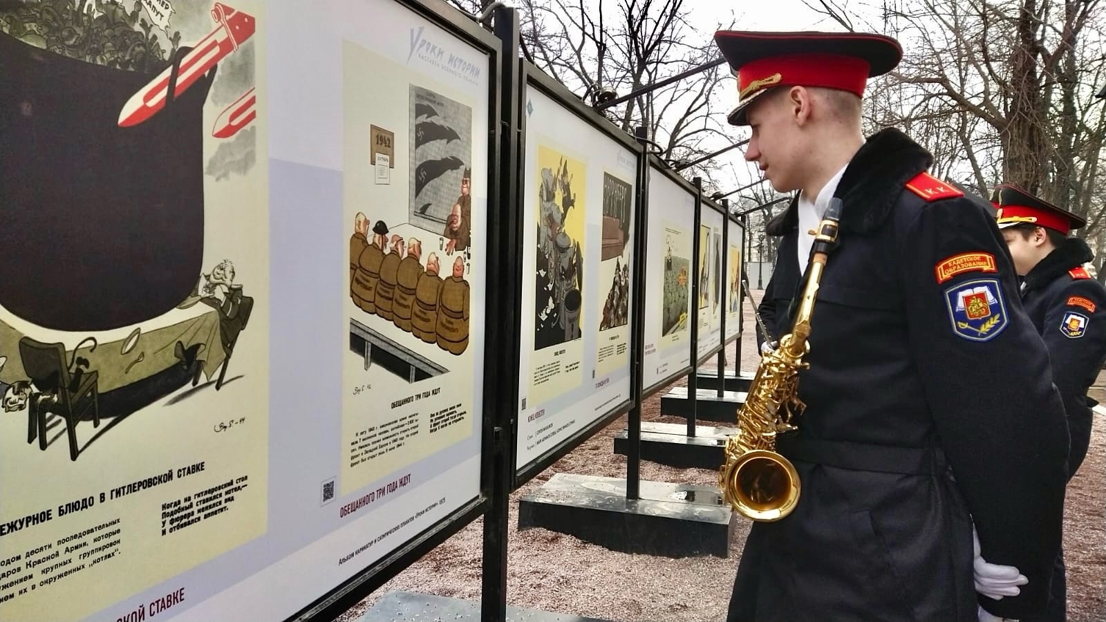 В честь открытия выставки оркестр исполнил любимые мелодии: «Катюша», «Мы пилоты», «Три танкиста», «Дорога на Берлин», «Идет солдат по городу».